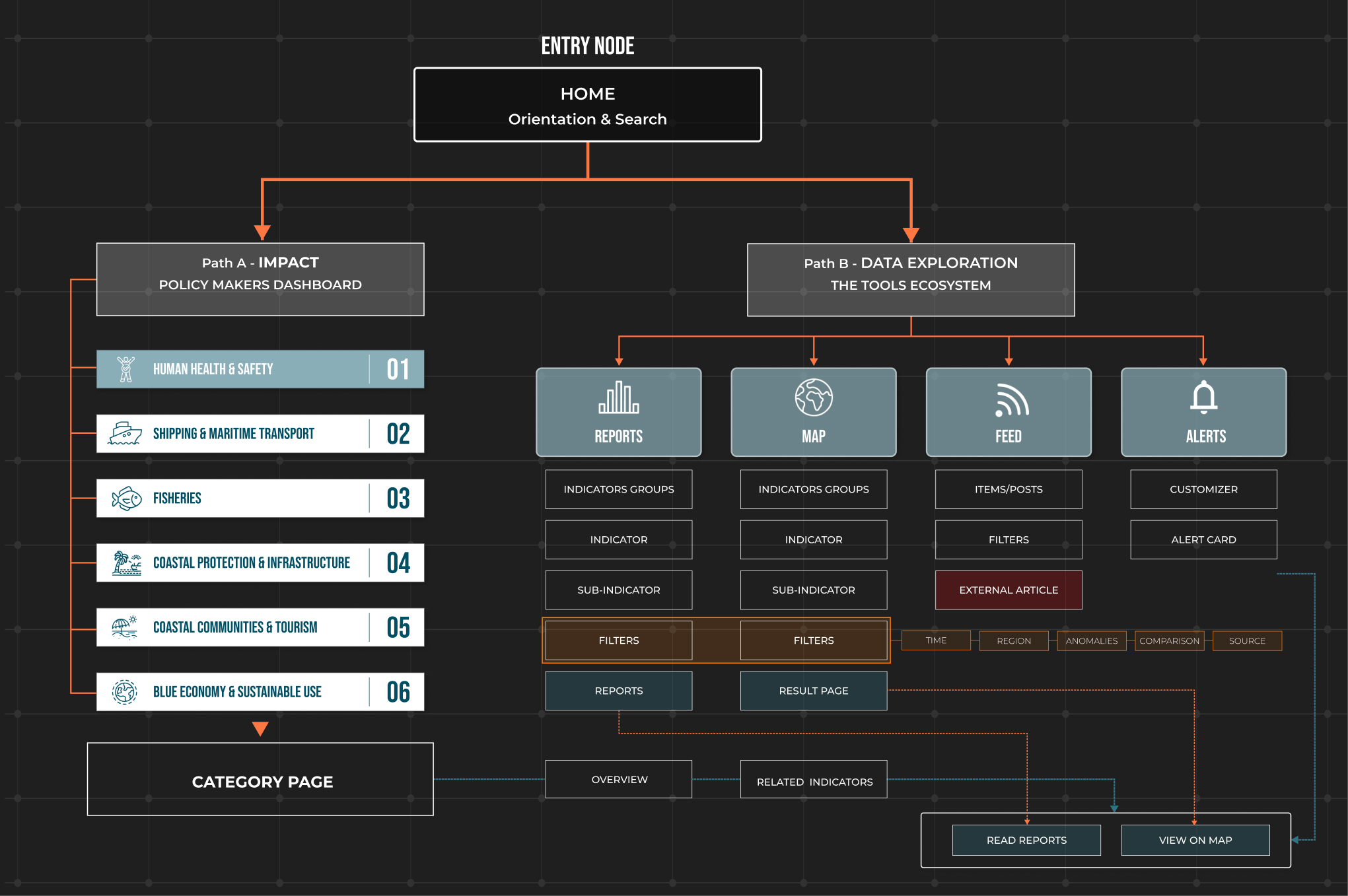 The platform ecosystem is divided into two primary entry points: a Policy Makers Section for high-level summaries and a Tools engine for deep data exploration.
