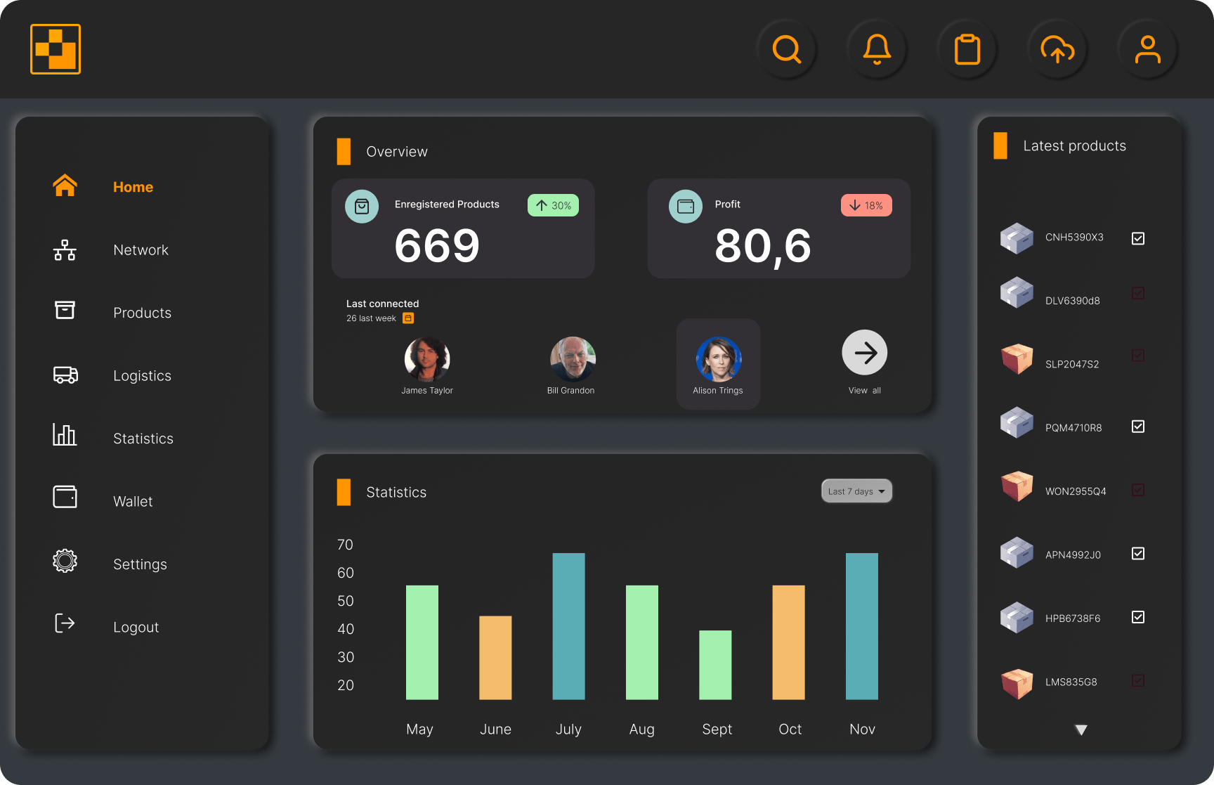 - ● Navigation: Redesign navigation to improve access to core modules (Products, Logistics, Network, Statistics), reducing cognitive load and making the structure easier to navigate.